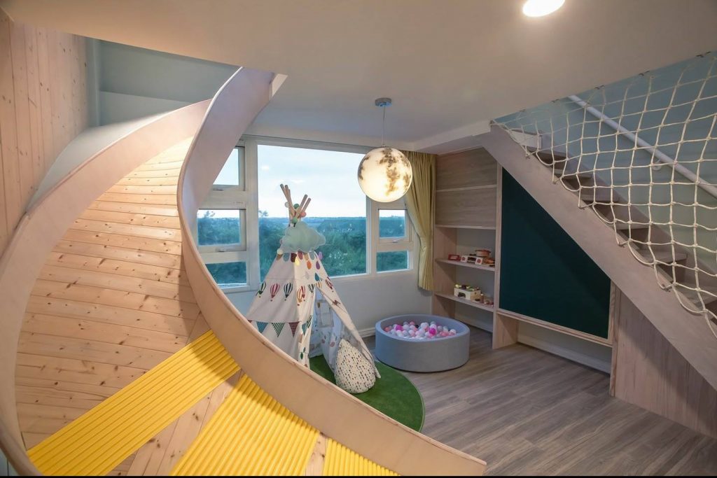 山丘洋房villa得夢想家房型內有小球池、小帳棚、家家酒玩具,一旁還有小孩最喜歡的溜滑梯。光是房間內就有這麼多設施,已經足夠讓孩子玩的不亦樂乎,爸媽也能安心的在房間內休息!